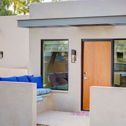 There are 201 eclectic, art-inspired guest rooms with modern amenities. Guestrooms are situated in casita-style bungalow clusters, each with an outdoor terrace, providing guests with a new take on an intimate desert experience. Each space is thoughtfully designed with unique folk artwork and fun aesthetics inspired by designs of the Zuni Tribe, Alexander Girard, and the traditional color wheel. The spirit of Cattle Track Arts Compound is infused within each guestroom, with eclectic works crafted by local artists. Accessible Rooms are ADA compliant with emergency strobe light, smoke detectors, cordless phone, closed-caption TV, lower level closet shelves, entryway features, and bathroom features, wider bathroom doors, bathroom grab bars, and raised toilet seat.
