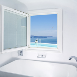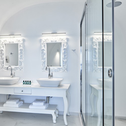 All suites feature bathrobes and slippers, a hairdryer, luxury toiletries, TV with satellite channels, a CD/DVD player, daily newspaper, safety deposit box, direct dial phone, refrigerated minibar, Nespresso coffee machine, a tea kettle, and complimentary Wi Fi access. River Pool Suite offers the unique experience of the River plunge Jacuzzi, a one of a kind private pool site. Elegantly minimal, the suite comprises an open plan bedroom with King Size bed and spacious living room, a large bathroom with rain shower and bathtub as well as a walk-in closet. Some come with separate bedroom from living room. At the private veranda, indulge in luxurious intimacy at the River plunge pool Jacuzzi and give in to stunning views of the Aegan Sea, the volcano and the caldera. The open air dining area is ideal for mouthwatering dinners in the Aegean breeze. Canaves Suite with Plunge Pool is designed for utmost relaxation in a freshly classic ambience. The suite features a master bedroom with King Size bed on a loft with rain shower bathroom, while on the lower lever is a second bedroom with Queen or twin beds and extra bathroom near the spacious living room area and dining area. The sauna room and the plunge pool at the private veranda offer the highest levels of luxury and relaxation while the open-air dining area and the amazing view to the volcano and the Aegean Sea complete your personal heaven in Santorini.