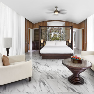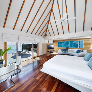 Grand Water Villa | Architecturally designed to blend effortlessly with the environment, the new Grand Water Villa is a sanctuary located in the Spa Retreat, off of the tip of the main island. Senses are awakened, not overwhelmed with a neutral palette that promotes space and timelessness. While away the day on the private deck, complete with a whirlpool and steps leading into the lagoon below. Upon entering the villa, be greeted by a living room with floor-to-ceiling glass windows that illuminate the room with natural light. Awaken each day in the spacious king bedroom, to the soothing sounds of the ocean and an abundance of light. The refreshed bathroom features a bathtub with ocean views and dressing area with day bed.