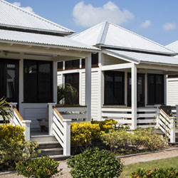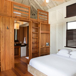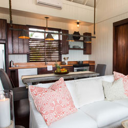 Family Cottage features two-and-a-half bedrooms, with ample living space, a master bedroom with large soaking tub and second bedroom with open-sir shower. Plus a bonus bunk room with two twin beds, perfect kids. In addition, enjoy a fully equipped kitchen, dining room, large living area and hammocks overlooking the sea canal.