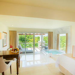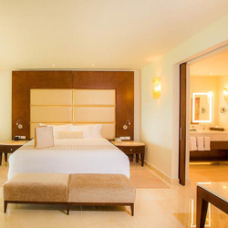 Junior Suite Golf Course allows golfers and non-golfers alike to appreciate this suite with a spectacular view of the 27-hole Jack Nicklaus Signature golf course. This guestroom additionally features a large screened terrace. And to help you get around, you’ll have the use of your own, personal golf cart. Wellness Suites offer guests direct access to an exclusive Wellness Area pool, special room service menu with healthy options, access to aqua spinning bikes and a private instructor, and more. Ambassador Suite is where you can relax in your tastefully appointed living room, where comfort and luxury peacefully coexist. Check out the ocean views from your private balcony, before strolling into the bedroom. Even with a king size bed, and double whirlpool bath, the room feels spacious and airy. Speaking of spacious, behold the massive walk-in closet, immediately next a two-sink vanity and marble bathroom. And yes, that is a second private balcony off the bedroom, replete with hammocks for swaying in the gentle ocean breeze.