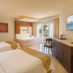 Each guestroom and suite includes a king bed or two double beds, a seating area, daily refreshed mini bar that contains sodas, water, juices, and beer; luxury bath amenities, hairdryer and straightener, safety deposit box, private bath with shower, liquor dispenser, coffee maker, bathrobes and slippers, and an iron with ironing board. Superior Deluxe Rooms allow you to relax and unwind to the calming sound of surf wafting through your balcony door. This room features spectacular views of the turquoise Caribbean waters. Designed for two adults, your guestroom comes with a private balcony, king bed, Smart TV with YouTube, vTuner and Weather Channel, double whirlpool tub, and luxurious in-room amenities featured in all Moon Palace guestrooms and suites. Concierge Level is where you can take your vacation to a whole new level. These special guestrooms designed for two adults feature an abundance of additional resort amenities, include two 25 minute massages at the Beach/Spa/Treatment rooms, private candlelight dinner and more.