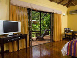 Plasma 27” cable TV, DVD / CD player, IPod stand, internet access, safe box (laptop capacity), air conditioning, private bathroom with hot water and rain shower, backyard with outside shower, in room "mini" bar service available, coffee maker, front balcony overlooking the volcano with jacuzzi for two, high speed internet connection