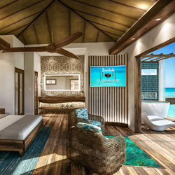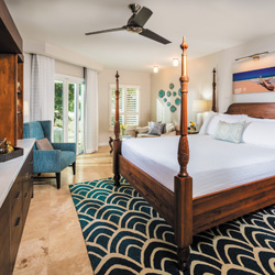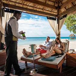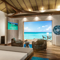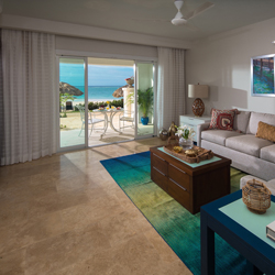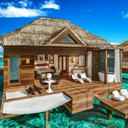 Over the Water Bungalows offer an unmatched connection to the Caribbean Sea and deliver complete immersion with fine turquoise waters and rich marine life below. Every bungalow captures the height of luxury with hardwood floors, vaulted ceilings, custom crafted king-size beds adorned with soft linens and plush pillows for the ultimate sleep experience. The spa style bathrooms are equipped with his and hers sinks, a large backlit mirror adorned with mosaic tile, and a walk-in rain shower. Outside, your private patio is equipped with an extended sun deck, outdoor shower, sun loungers, and a bistro set for two. These bungalows also boast Butler Elite service, which handles every detail of your vacation with unobtrusive grace, and 24 hour room service to complete your over-water vacation. Additional amenities include personal airport greeting, expedited immigration, private luxury transfers, a welcome gift, and luxury bath amenities.