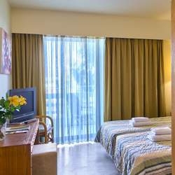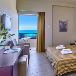 At Santa Marina Beach Hotel there are a total of 188 accommodation units, within two separate complexes (connected via underground tunnel); a beach complex and a pool complex. The beach complex houses 122 units while the pool complex houses 66 units. The Beach complex has one suite and all the remaining units are standard sea front double rooms and standard garden view double rooms. The Pool complex has one suites, 7 maisonettes and all the remaining units are standard pool view double rooms and standard garden view double rooms. All the units are well designed and furnished comfortably. Modern touches add décor flair, pastel colors, marble and tiled floors soothing lighting all contribute to their hospitable atmosphere. Room amenities include wifi, individually controlled air conditioning, flat screen TV with satellite channels, direct-dial telephone, hairdryer, shaving socket and bathroom amenities. A mini-bar and safe box are available at an extra charge.