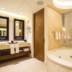 Secrets Akumal Riviera Maya offers 434 luxurious guest suites, each featuring a king-size bed (or two double beds), private terrace or balcony, in-suite Jacuzzi for two, complimentary mini-bar and much more. In-suite amenities include: private, furnished terrace or balcony, one king-size bed or two double beds, his-and-her armoire, sofa jacuzzi for two in every suite, ceiling fan, electronic safety deposit box (laptop size), iron and ironing board, vanity mirror, hair dryer, 24-hour room service, night table with lamp, 42” satellite TV, DVD player, concierge in every building, complimentary mini-bar refreshed daily with soft drinks, bottled water and beer, coffee machine/tea maker, alarm clock with iPod® dock, direct dial telephone, electric voltage – 110V, and complimentary internet access.