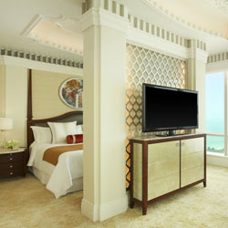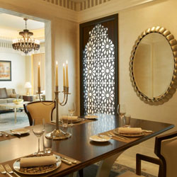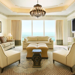 Each of the resort’s 283 rooms revels in a magnificent view of the alluring Abu Dhabi Corniche. The signature St. Regis Butler Service is complimentary for every room in the hotel. Other amenities include onyx and marble finishes, king or two double queen beds, rain showerheads, separate water closets with bidets, chandeliers, ADA features such as lowered basins, additional handrails and wheelchair accessible outlets, and connectivity with other rooms.