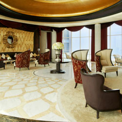 Suites offer a higher level of sophistication with hand-tufted wool carpet, onyx, Mother of Pearl, marble, limestone, fine wood inlays, leather walk-in closets, kitchens, separate studies, dining areas, complimentary luxury automobile transfers, and more. Al Mushref Suites accommodates up to six people within 1,562 square feet. BMW or Mercedes transfers are a much appreciated upscale amenity. Al Manhal Suite boasts a dining room for 10 and a spacious majlis with its own separate dining room, kitchen, powder room and dressing room, walk-in wardrobe, his and her vanities, free-standing bathtub, state-of-the-art treatment room, and Bentley transfers. Up to five people can enjoy 3,229 square feet of pure luxury. Al Hosen Suite welcomes you with 3,875 square feet for five guests, a grand entrance hall, impressive majlis, dining room with living area, separate study, kitchen, spa, gym, dressing room and Bentley transfers as well. Abu Dhabi Suite astonishes with a 360 degree view and incomparable 12,056 square feet to sleep eight people. The premier choice for the most discerning guests this iconic suite has a private entrance, three bedrooms, maid’s room, two powder rooms, lounge bar, cinema, spa with sauna, gym, double-height majlis, and skybridge living room suspended between the resort’s towers.